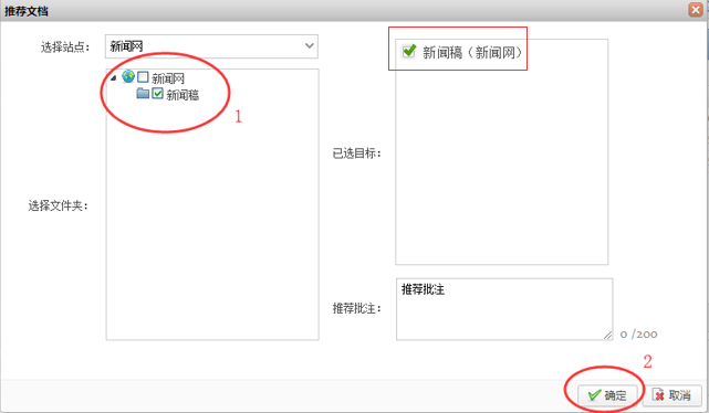 3、在弹出对话框的“选择站点”项的下拉菜单中选择需投稿的站点,然后在“选择文件夹”栏目中选择需投稿的栏目(如:新闻稿栏目),再点击“确定”即可,如下图: