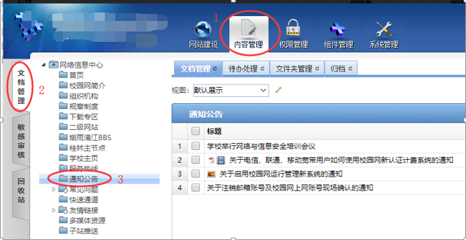 1、登录网站群管理平台,切换到“新闻网”管理后台,若出现黄底白色数字的提示按钮,表示有“待办”事项,如下如所示: