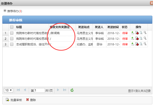 2、点击黄色按钮,可查看需要处理的“待办事项”,如下图(“接收文件夹路径”表示文章在那个文件夹,“/” 表示在根文件(新闻网)下, “/新闻稿”表示在“新闻稿”文件夹):