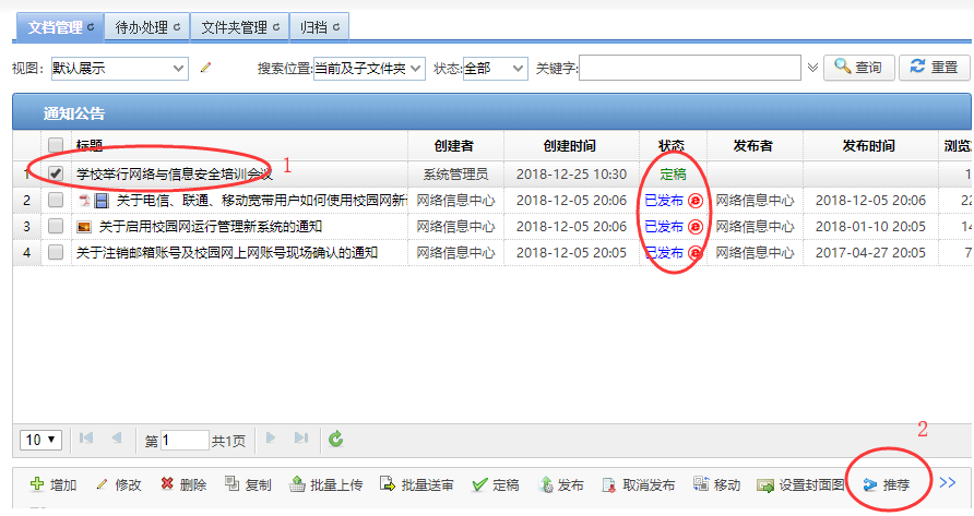 2、选择要推荐的文章(状态必须是“定稿”或“已发布”),然后点击“推荐”按钮,如下图: