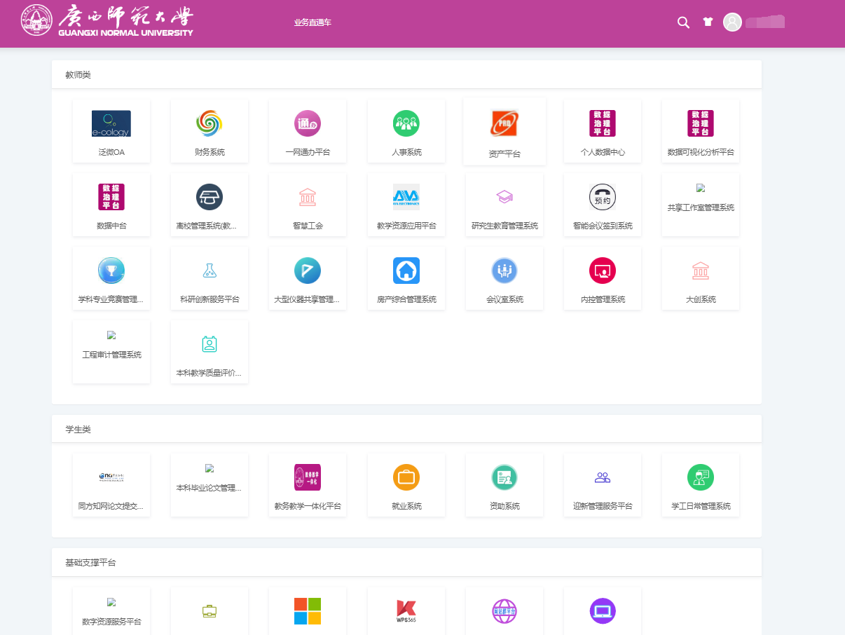 同样的,大家也可以进入统一身份认证系统(网址:https://sso.gxnu.edu.cn)在里面选择你需要进入的系统,从这里进入其他业务系统是不再需要输入密码的。注意该链接仅限校园网内访问,如您在校外,可以先登录学校VPN进行使用。学校VPN使用说明请参考:vpn.gxnu.edu.cn
