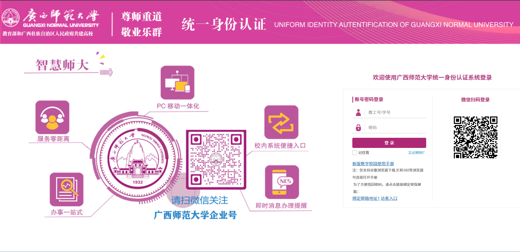 广西师范大学统一身份认证平台的总目标是实现全校老师和学生使用一套账号密码,就能够进入学校所有信息业务系统。解决师生需要记忆“多个账号密码”的困扰。下图就是它的登录页面: