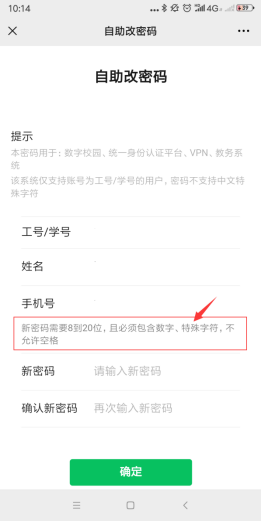 点击【自助密码修改】,会自动带出你的个人信息,请注意新密码的组成为“数字+字母+特殊符号”,密码长度为8-12字符,如不符合要求,修改密码将会失败。