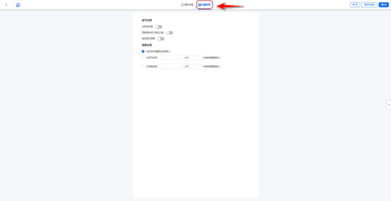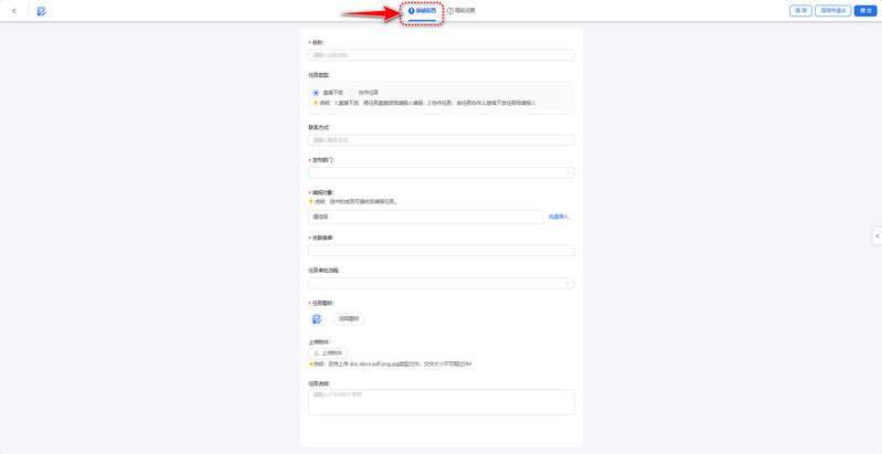 1、信息暂存。在进行表格任务发布配置时,如果需要暂时离开,为避免因长时间未操作而导致系统自动退出,进而丢失已填写的内容,请点击页面右上角的“保存”或“保存并退出”按钮,以确保当前配置的信息得到保存。
