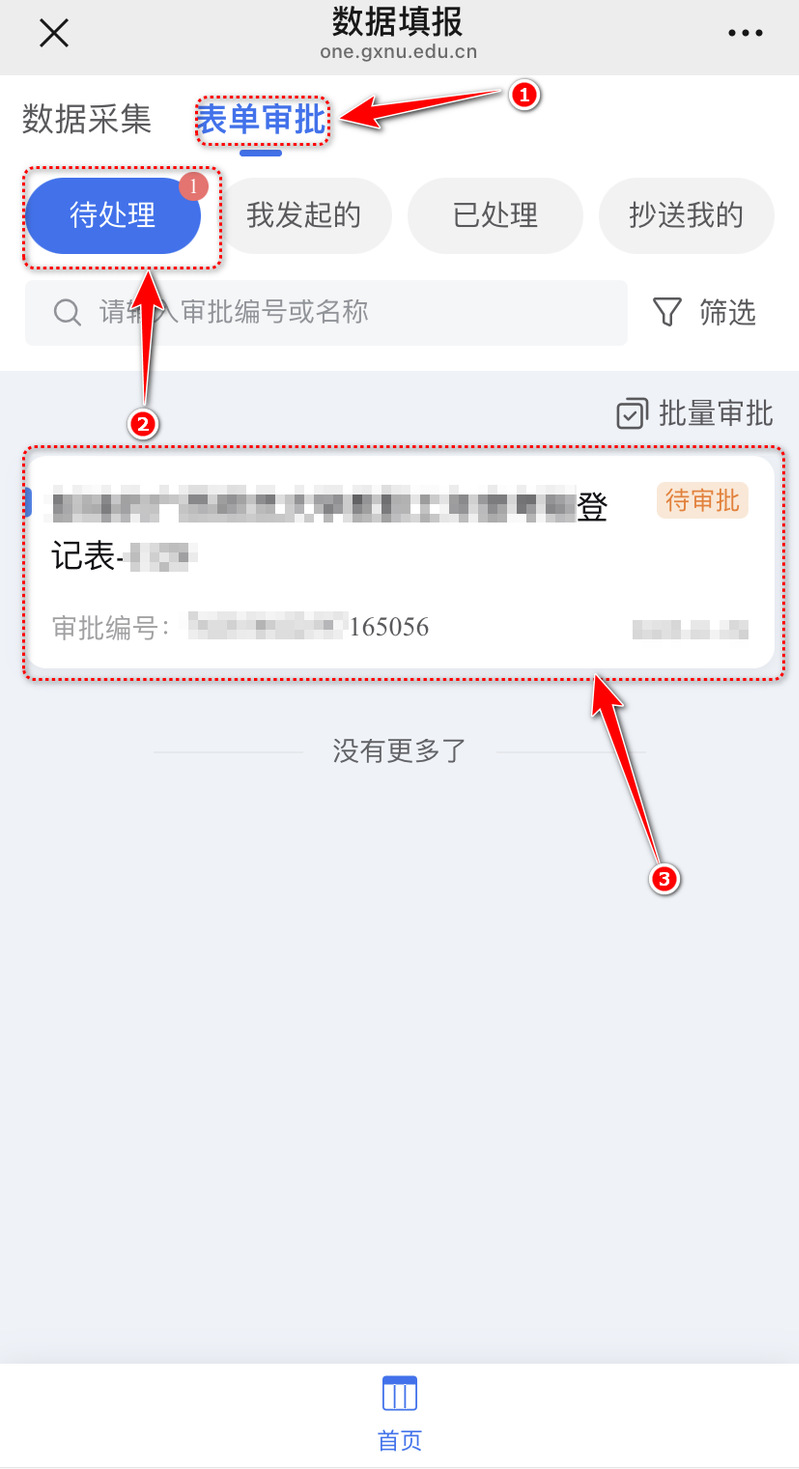 1、进入一表通系统移动端首页,点击“表单审批”栏目,进入后切换至“待处理”标签查看待审核表格。