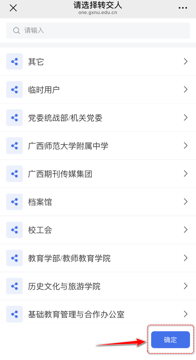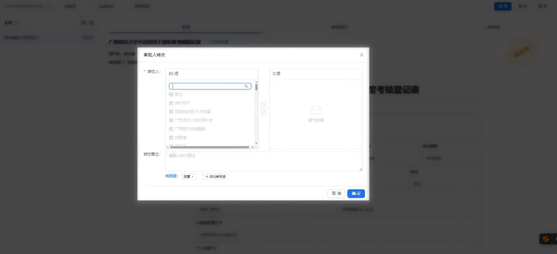 (4)转交:表示当前表格需要由其他审批人继续处理。点击审批页面左下角的“转交”按钮,选择转交人,点击“确定”按钮完成转交。