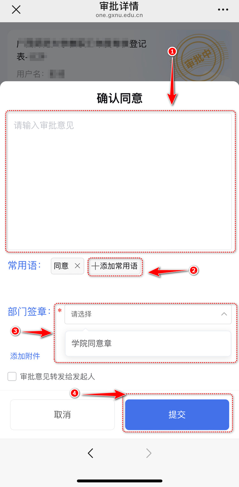 (1)同意。填写审批意见,若需要,可将其添加为常用语。选择电子签章后,点击“提交”按钮完成审批。