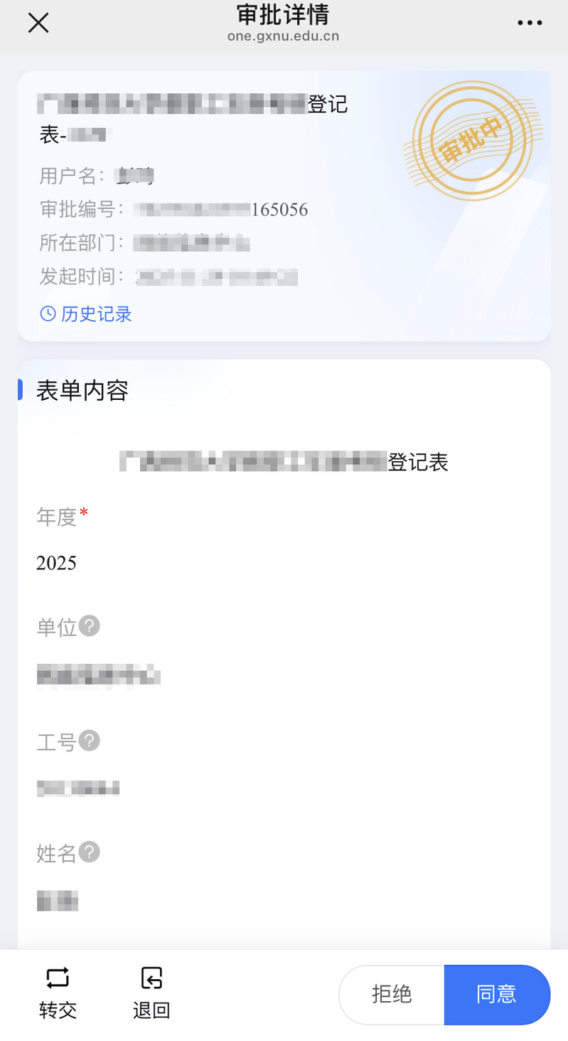 若当前审批任务应由他人负责,审批人可选择“转交”操作,将任务转交给其他审批人继续处理。