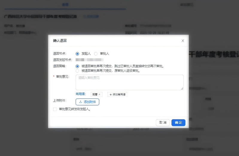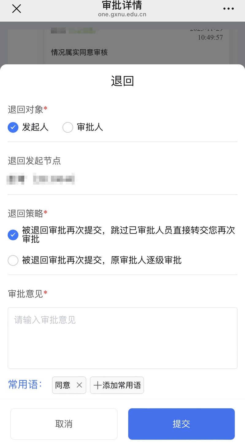 (3)退回:表示对表格内容有疑问或需要申请人修改补充内容。点击审批页面左下角的“退回”按钮,选择退回对象,填写相关意见后点击“提交”按钮完成操作。