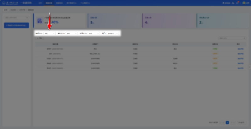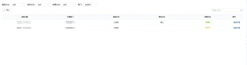4、在此页面中,系统提供四种条件筛选方式,分别为按填报状态、按审批状态、按结果状态和按部门筛选。通过设置筛选条件,用户可以快速定位所需数据。