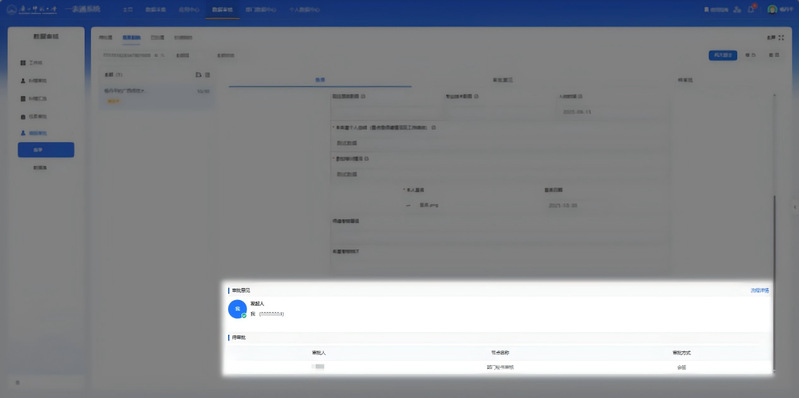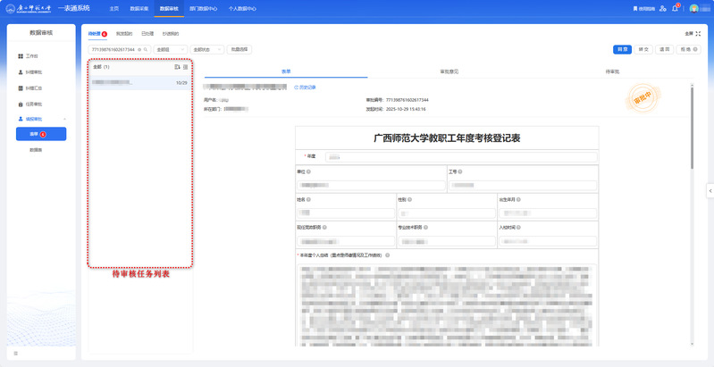 4、在审批页面中,系统将完整展示提交人填写的表格内容。页面左侧可选择不同的表单,便于查看多个填报人提交的表格,支持逐一审批和批量审批。