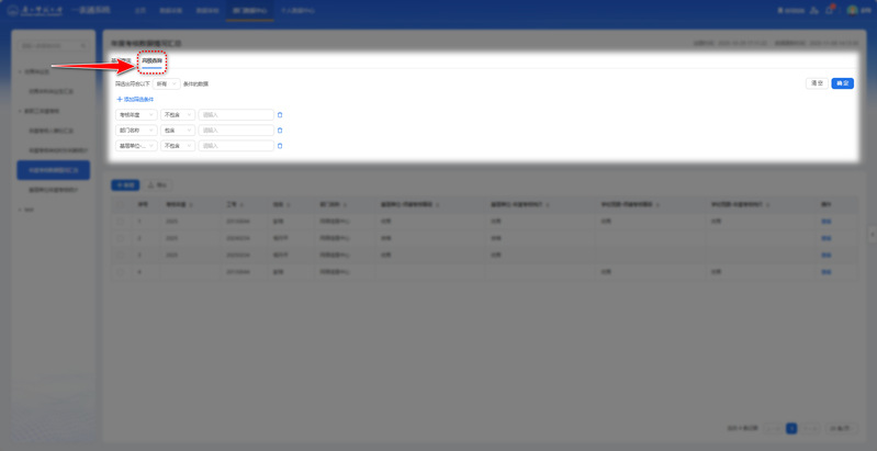4、在高级查询区域,用户可以设置更为精确的筛选条件。例如,可查询某个部门的汇总数据,同时排除特定年度(如 2023 年和 2024 年)的记录,以实现更有针对性的数据统计与分析。