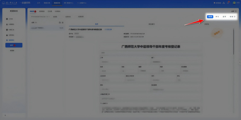 5、审批人可在阅读并确认表格内容后,依据实际情况再页面右上角选择三种操作。