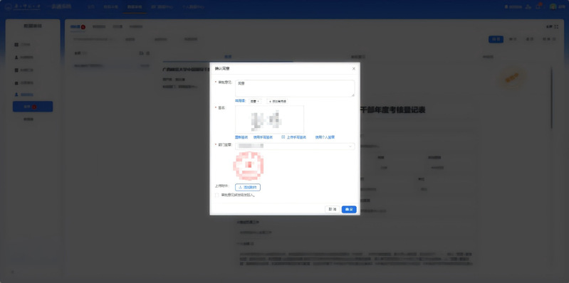 当确认表格内容准确无误后,可选择“同意”操作。该操作表示同意通过当前审批,并将表格流转至下一审批节点;若当前节点为最终审批节点,表格即完成整个审批流程。在执行同意操作前,审批人需根据表格具体要求填写登记评定或审核意见,并完成签名与签章。