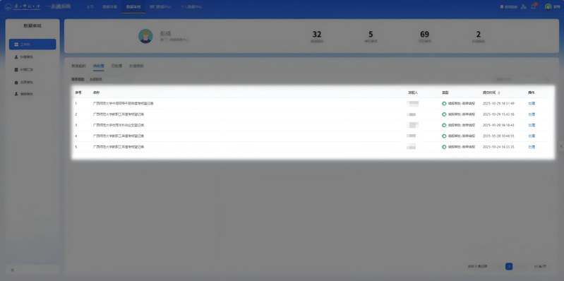 当师生提交填写完毕的表格后,系统将根据预设的审批流程自动进入审批环节。不同类型的表格可根据任务需求设置不同的审批节点和审批人,例如部门秘书、部门负责人、分管领导等。每位审批人需要在审批中心及时处理系统分配的审批任务,确保表格任务按流程顺利推进。